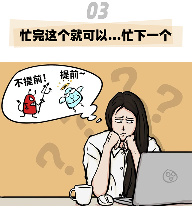 有提前症的人,对于工作一般习惯遵循“宁可备而不用,不可用而无备”,在真正的DDL之前已经演练了很多遍,看起来非常靠谱。而为了达到这种状态,他们宁可委屈自己,往往付出额外的努力,牺牲正常的休息和娱乐时间。